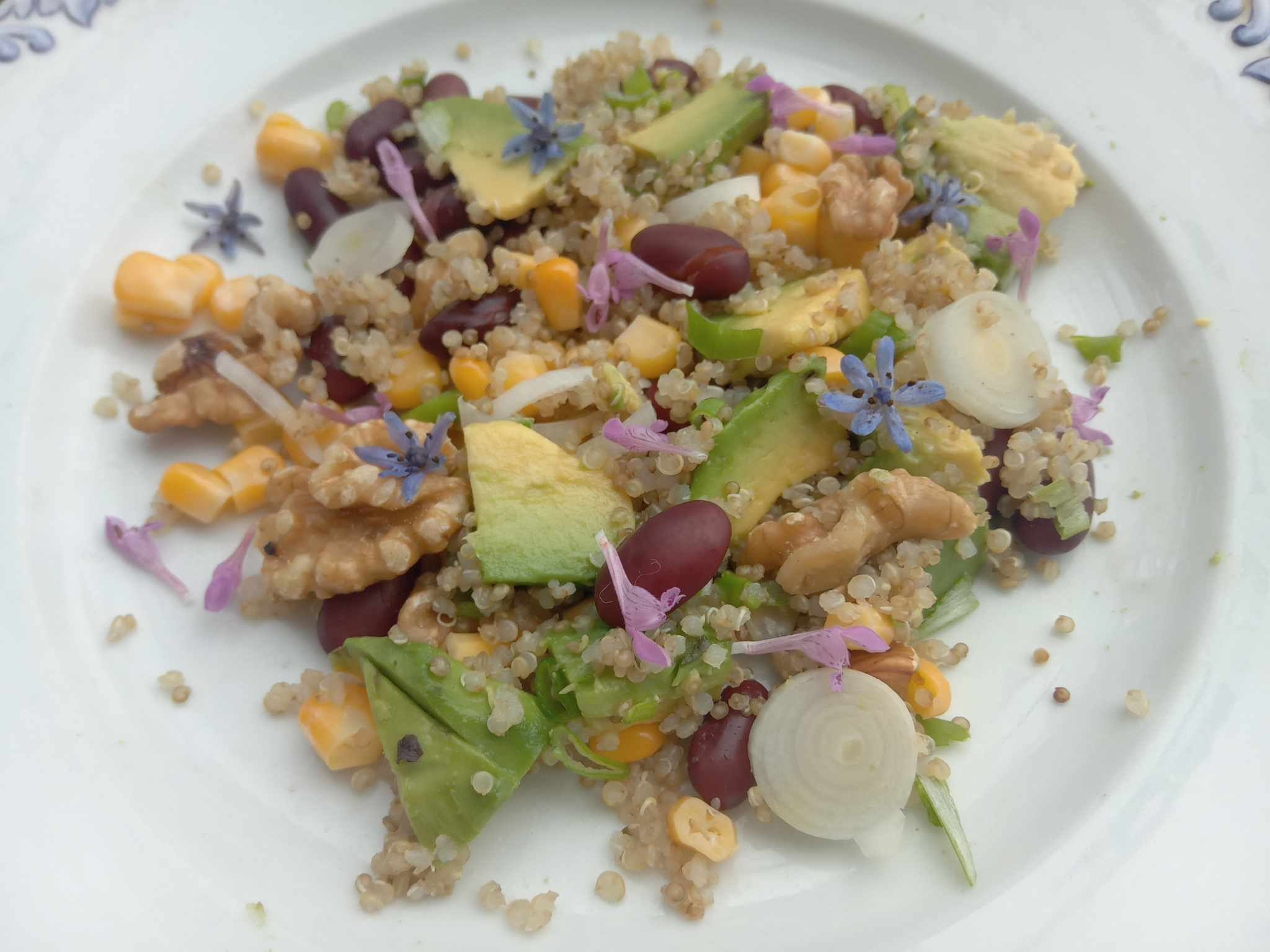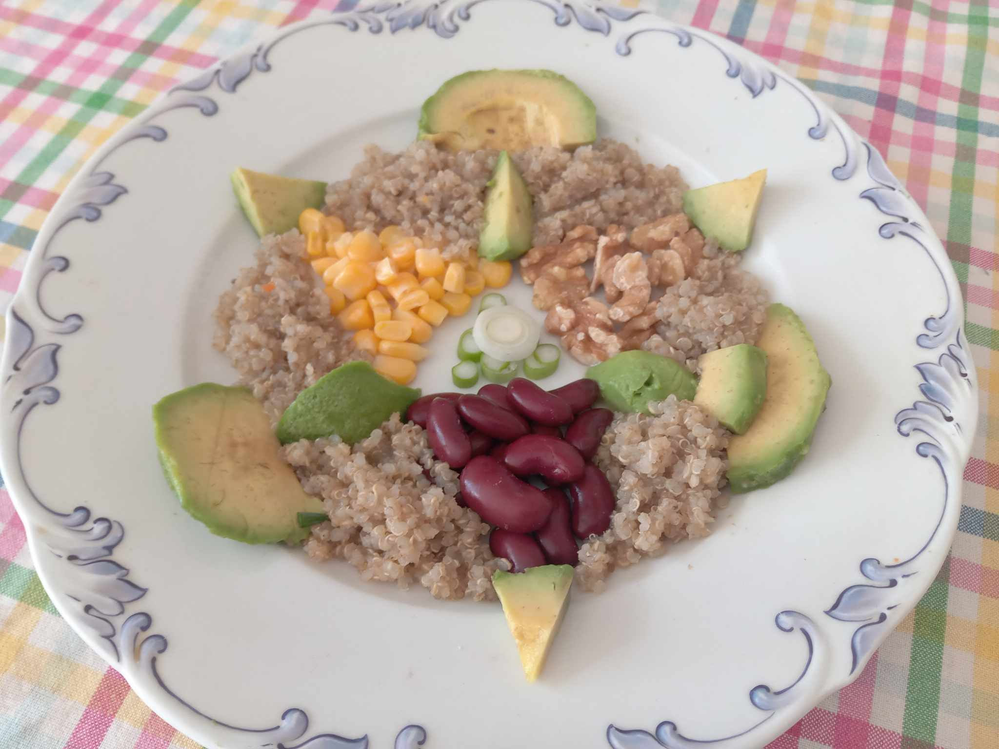 Fazuľa, kukurica a quinoa sú uvarené zvlášť. Na surovo je pridané avokádo, jarná cibuľka a orechy.