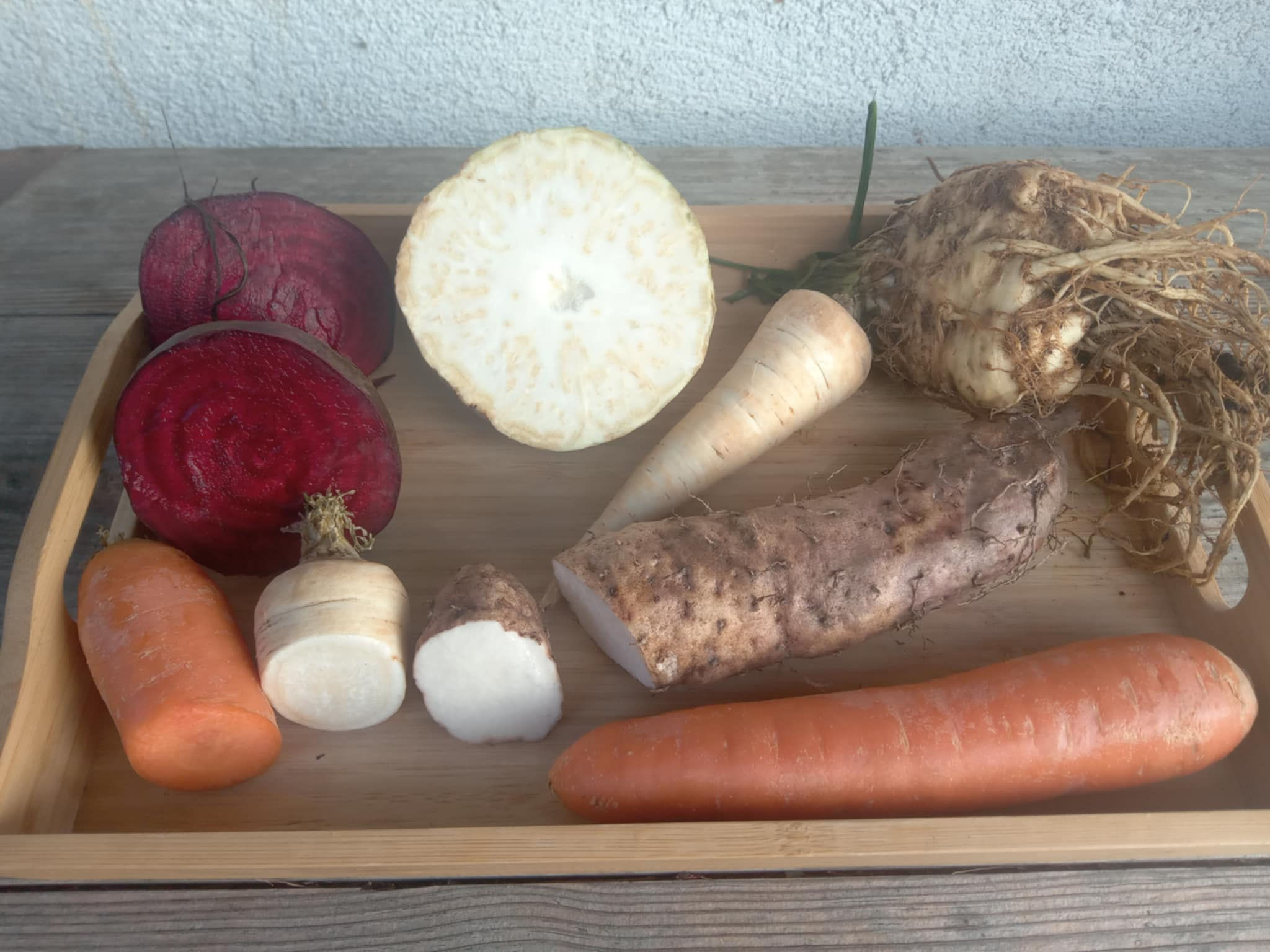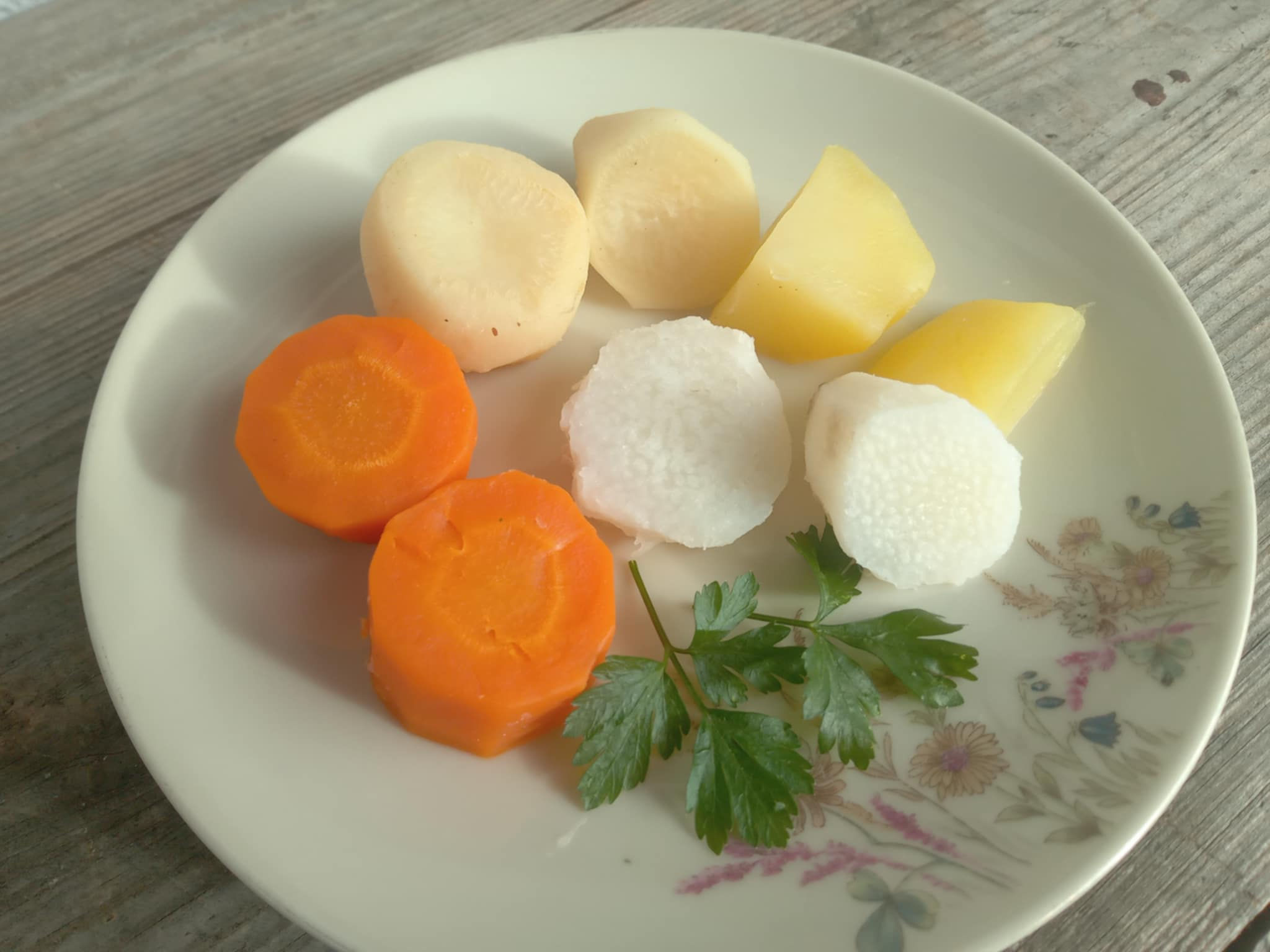 Na obrázku je ukážka uvarených koreňov: mrkva, petržlen, zemiak (podzemná hľuza) a svetelný koreň.