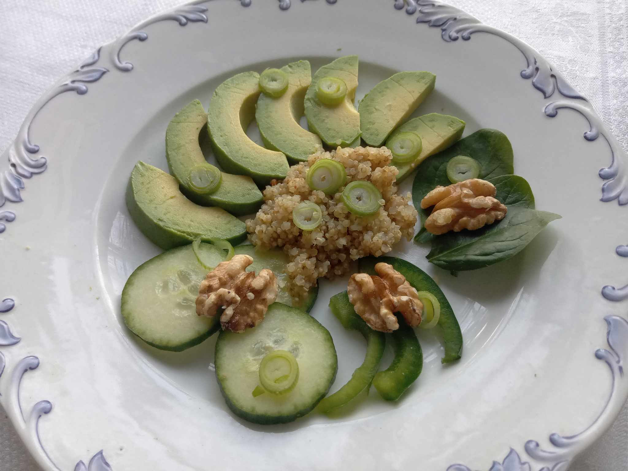 Fazuľa, kukurica a quinoa sú uvarené zvlášť. Na surovo je pridané avokádo, jarná cibuľka a orechy.